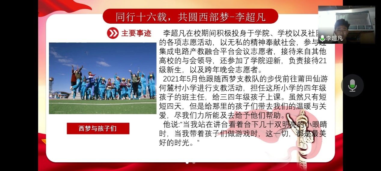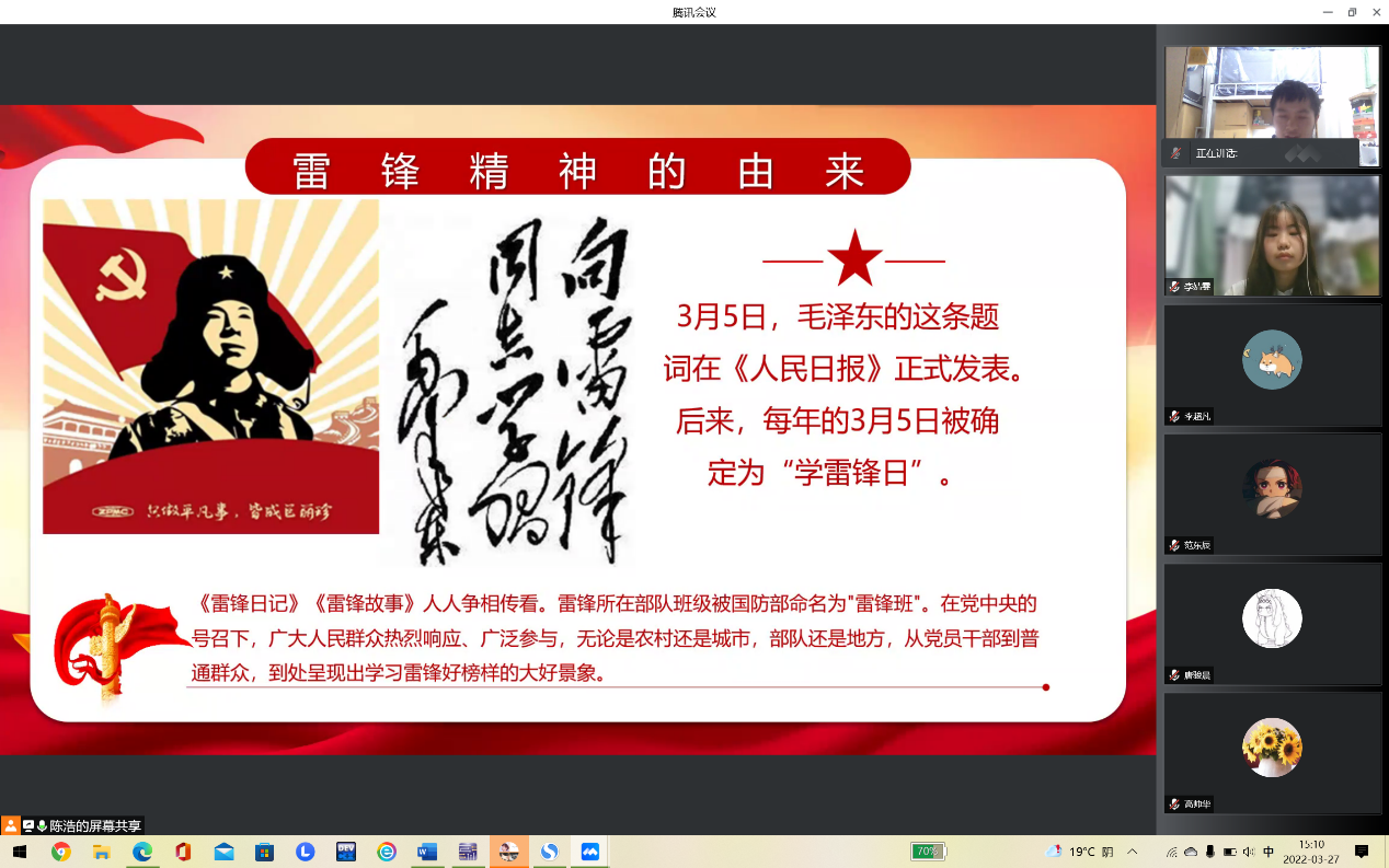 2022年3月5日是第59个学雷锋纪念日,这既是对雷锋同志最好的纪念,也是对雷锋精神的发扬光大。3月27日下午,电子科学与技术学院通过线上会议举办了“党建带团建,学习中国共产党人精神谱系”系列活动之“芯青年,志愿心,弘扬雷锋精神”学习活动。电子科学与技术学院本科生第一党支部党员和2020级微电子科学与工程班级团员共同参与。