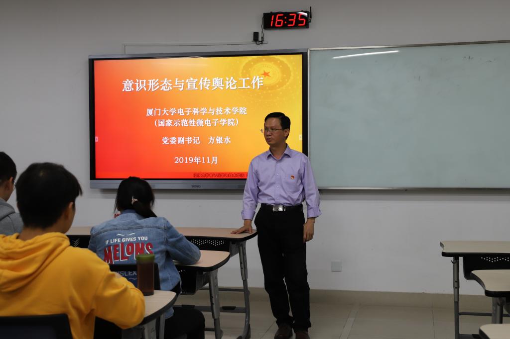 方银水为2019级全体硕士生党员讲党课《意识形态与宣传舆论工作》,从“什么是意识形态”,“为什么说意识形态工作极端重要”,“意识形态领域形势依然复杂、挑战依然严峻”,“怎样应对意识形态领域的挑战”等方面全方位进行了认知与讲解。