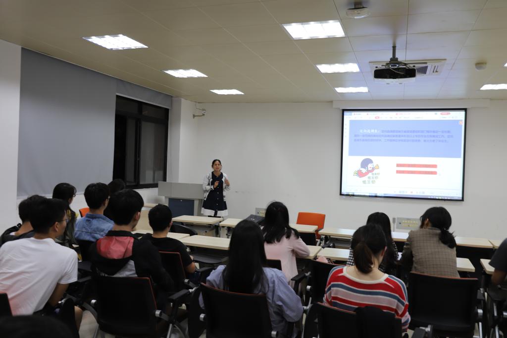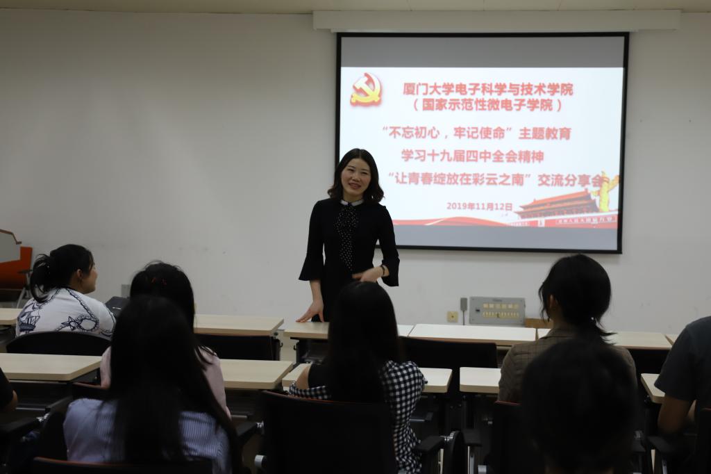 2019年11月12日晚上8时,厦门大学电子科学与技术学院在厦门大学海韵园科研一106举办“不忘初心、牢记使命”主题教育“今后为事业发展贡献什么”固定党日活动,活动邀请优秀选调生代表陈迪萌博士向毕业生分享选调生笔试面试经验。本次活动也是学院在主题教育当中开展的“为民服务解难题”系列活动之一,学院辅导员刘锦锗出席活动。本次活动由2018级电子工程系硕士生1班党支部书记林钊圳主持。