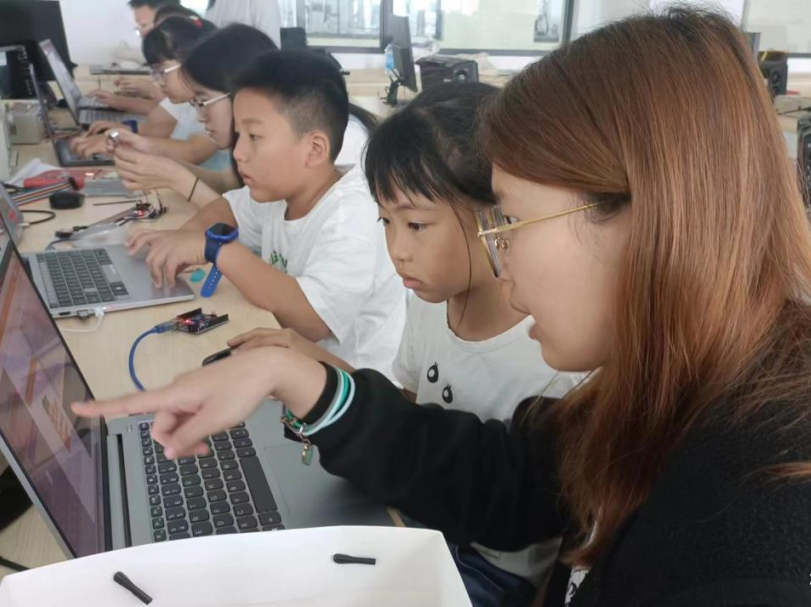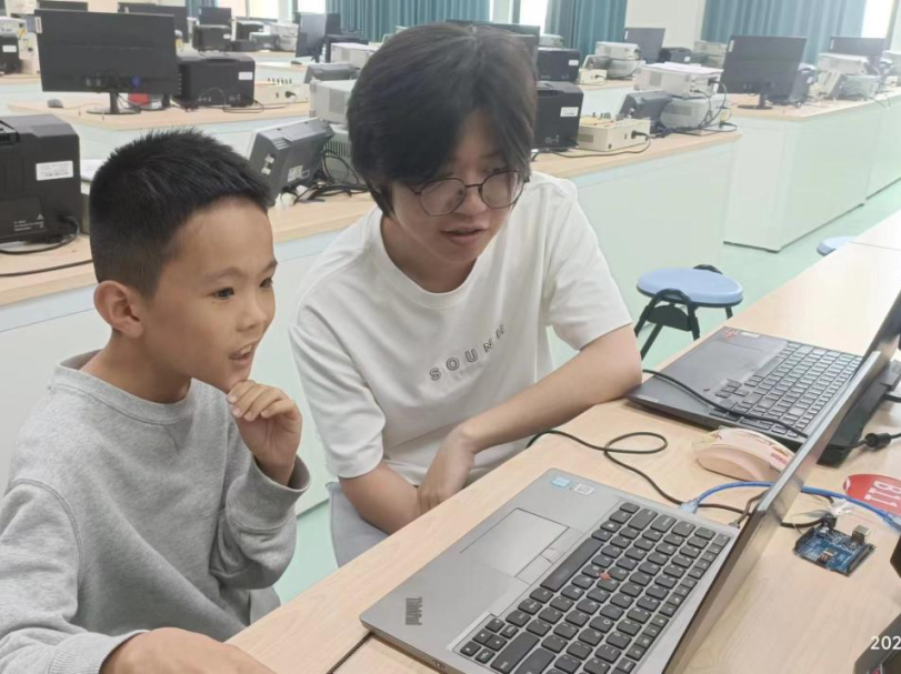 南强电子设计协会的成员们分组对演武小学的同学们进行一对一的科创帮扶指导,耐心、热情地指导小朋友们完成基础电子知识、微控制器引脚相关知识、图形化编程的概念逻辑等知识的学习。