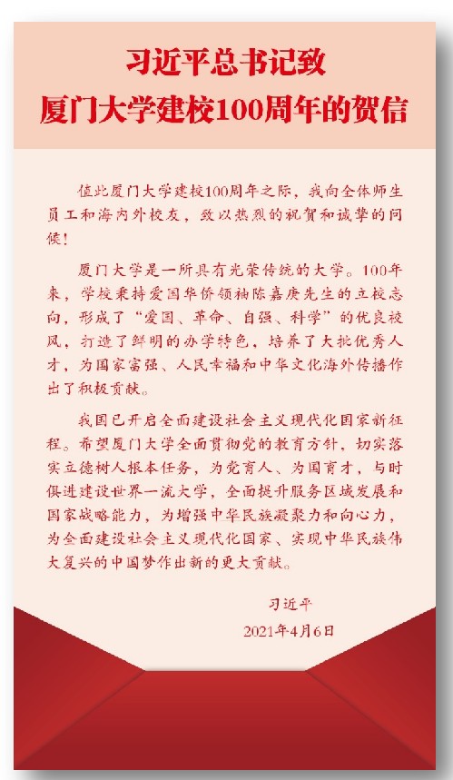 石慧霞与同学们共同学习了习近平总书记关心关怀厦门大学,特别是习近平总书记致厦门大学100周年校庆的贺信。她希望同学们牢记嘱托,从嘉庚先生的立校志向中汲取自我成长的力量;守正创新,不断弘扬爱国、革命、自强、科学的优良校风,为国家富强,人民幸福,中华文化海外传播做出厦大电子人的积极贡献。