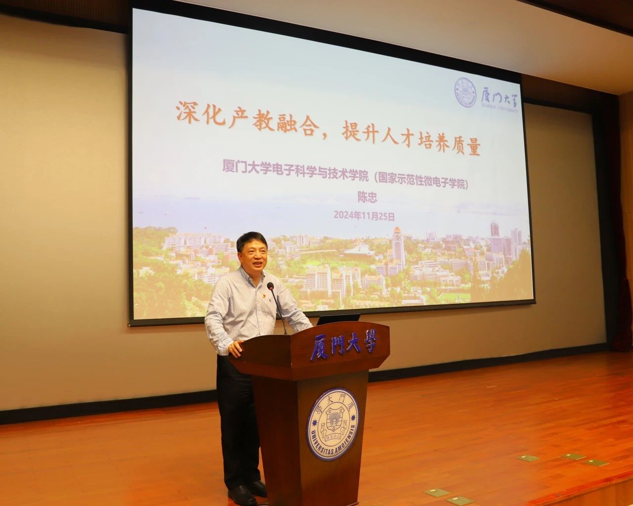 在专题报告环节,陈忠作题为“深化产教融合,提升人才培养质量”的报告。他从学院历史和发展现状、产教融合与人才培养、创新驱动与产业发展三个方面进行系统阐述。他介绍,学院正在着力建设国家集成电路产教融合创新平台,努力将其打造成集产业人才培养、技术研发、学科建设于一体的区域共享型创新平台。他指出,学院将充分利用“侨台特海”区位优势,优化拔尖创新人才培养体系,形成“立足厦门、服务海峡两岸、辐射马来西亚”的人才培育、技术攻关联合体,为助力高水平科技自立自强贡献“芯”技术、“芯”人才。