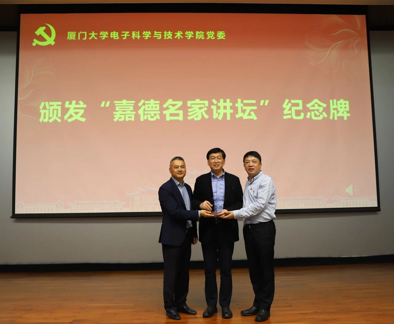 随后,陈忠和李希龙共同为黄福涛颁发“嘉德名家讲坛”首讲纪念牌。颁发仪式前,石慧霞介绍了“嘉德名家讲坛”的命名由来。她说,“嘉德”命名缘自电子校友们对厦大精神文化的认同:“嘉德”意为美好的品德,来源于校友们对陈嘉庚、谢希德两位厦大先贤的纪念和敬意;在厦门大学校友会电子分会和厦门嘉德电子与集成电路研究院的支持下,“嘉德名家讲坛”旨在为学院师生搭建高水平党建和学术交流平台,继承先辈遗志,坚持科技报国,传承和弘扬厦大精神,团结奋进、温暖前行。