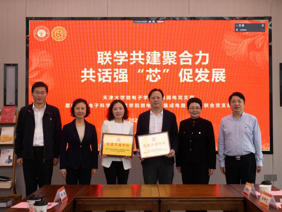 党支部共建授牌仪式上,在贾果欣、马凯学、石慧霞、陈忠的共同见证下,微电子学院院长助理李敏、于大全互授“党建共建单位”牌匾。下一步,微电固电党支部、微电子与集成电路系师生联合党支部将以本次共建为契机,深化在科创竞赛联合指导、产教融合项目协同推进等方面的合作,共同助力微电子领域人才培养与技术创新。