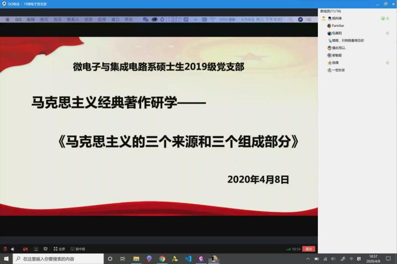 4月8日,微电子与集成电路系硕士生2019级党支部开展“马克思主义经典著作研学”活动的第二次学习,由支部书记胡向涛带领支部成员展开对《马克思主义的三个来源和三个组成部分》一文的专题学习。并对近期国家、学校的热点问题进行讨论。