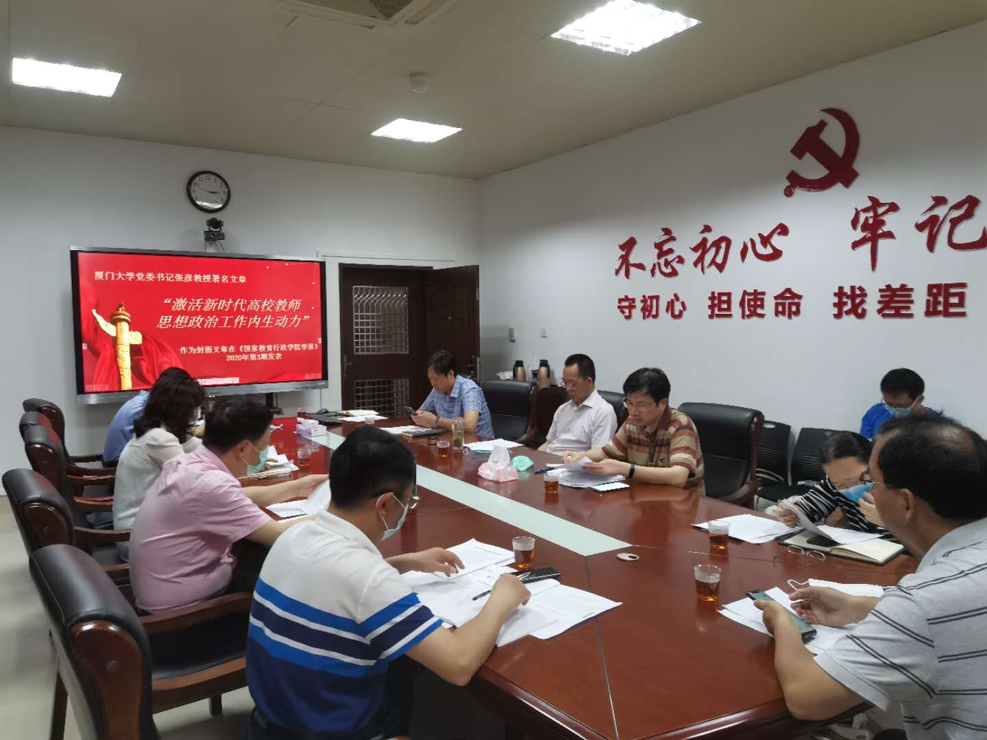接着,由院长、党委副书记陈忠领学“习近平总书记在决战决胜脱贫攻坚座谈会上重要讲话”。全体参会人员一致表示,必须切实把思想和行动统一到习近平总书记重要讲话精神上来,深刻认识打赢教育脱贫攻坚战的极端重要性、任务艰巨性和形势紧迫性,进一步增强决战决胜脱贫攻坚的责任感、使命感和紧迫感,要以落实《厦门大学2020年定点扶贫工作计划要点》为主要抓手,充分利用学科智力和科技优势,开展“精准式”脱贫攻坚行动。吴国瑛指出,全院师生、党员干部要强化责任担当,用实际行动助力脱贫攻坚,一是要继续加强学习,深刻领会讲话精神;二是积极引导师生开展教育扶智,助学筑梦等实践活动;三是充分利用产教融合平台,着力推进科技成果转化;四是积极响应消费帮扶倡议,动员党员干部参与“以购代捐”活动。