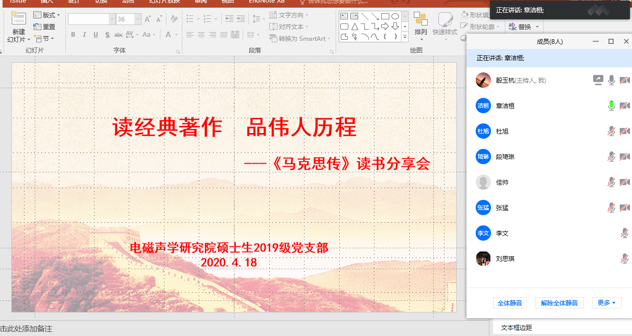 4月18日,电磁声学研究院硕士生2019级党支部开展了“读经典著作品伟人历程”读书分享会活动。支部书记殷玉杭带领支部成员集体回顾了经典书籍《马克思传》片段,并结合当前学习生活情况进行了阅读感想分享。