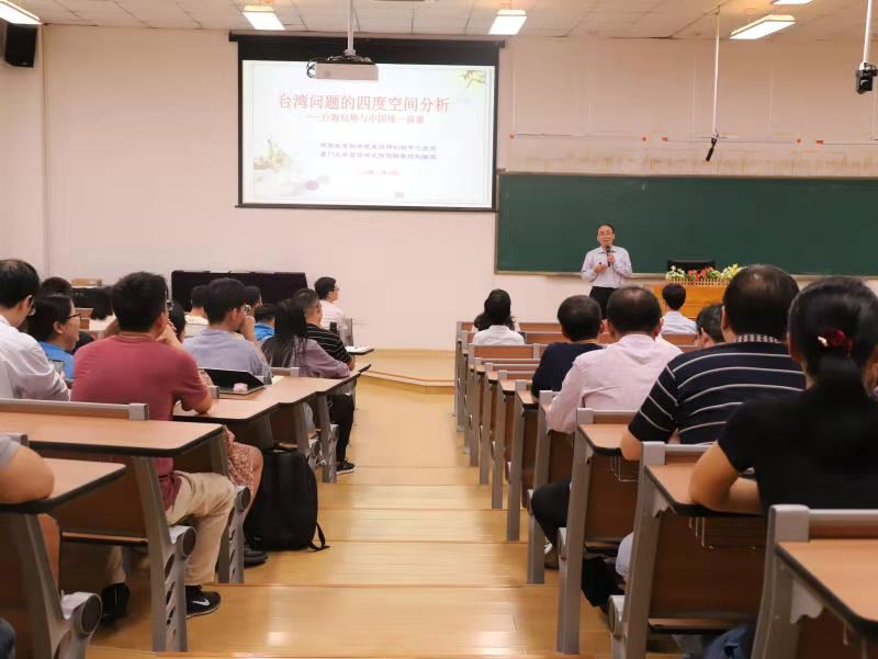 11月20日下午,电子科学与技术学院在物理大楼117报告厅召开政治理论学习大会。“闽江学者”特聘教授、“两岸关系和平发展协同创新中心”执行主任、台湾研究院教授刘国深受邀作了《台海局势与国家统一前景——台湾问题的四度空间分析》专题报告。报告会由学院党委书记吴国瑛主持。
