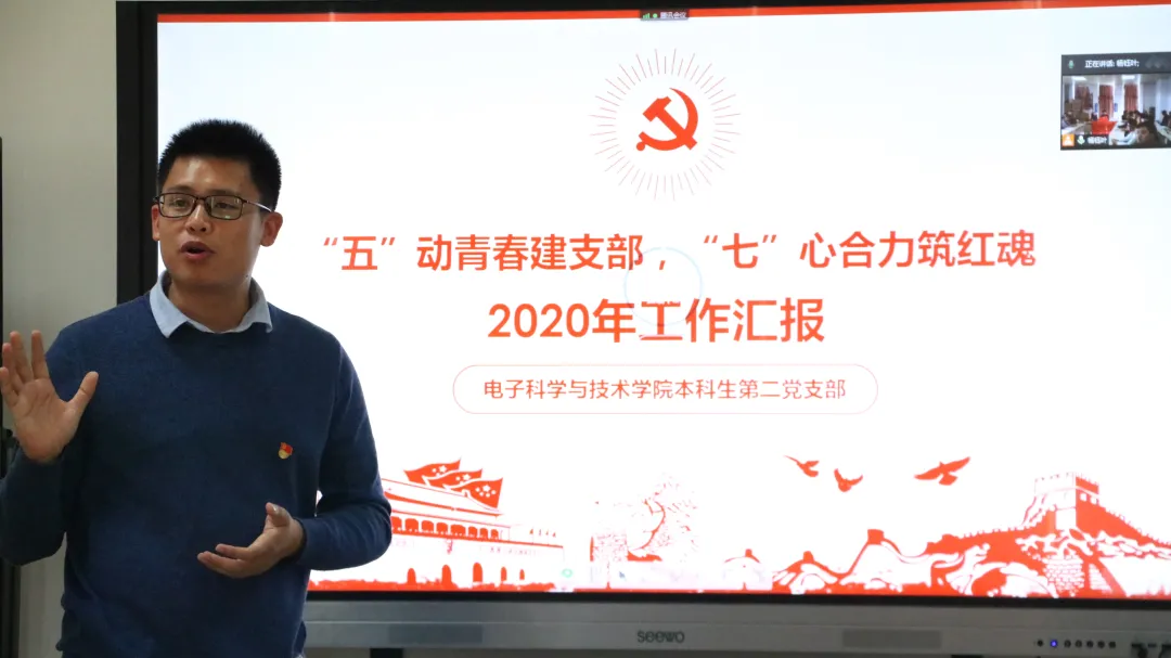 3月12日,电子科学与技术学院本科生第二党支部在科研二313召开了2020年度党支部组织生活会暨民主评议党员大会,主要内容是2020年度工作汇报、查摆支部突出问题、党员批评与自我批评、党支部委员会及党员民主测评四个环节。学院党委副书记郑莉及15名正式党员、11名预备党员参加线下会议,1名预备党员参加线上会议。