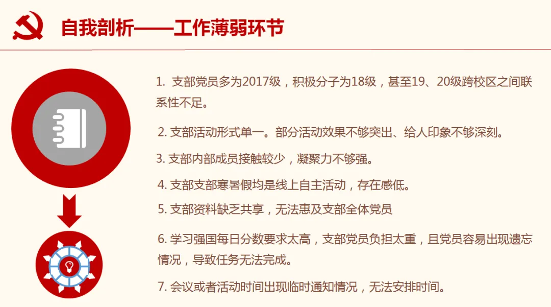 支部书记严威带头进行自我批评,深刻剖析了自身存在的不足,对自己进行反思,并积极邀请其他党员同志指出其不足,为支部党员们进行批评与自我批评开了个好头。之后,支部党员同志从思想上、学习上、生活上对自己进行了深入的自我批评,其他党员同志也相互进行批评,从而帮助同志意识到问题所在,帮助同志积极改正问题。