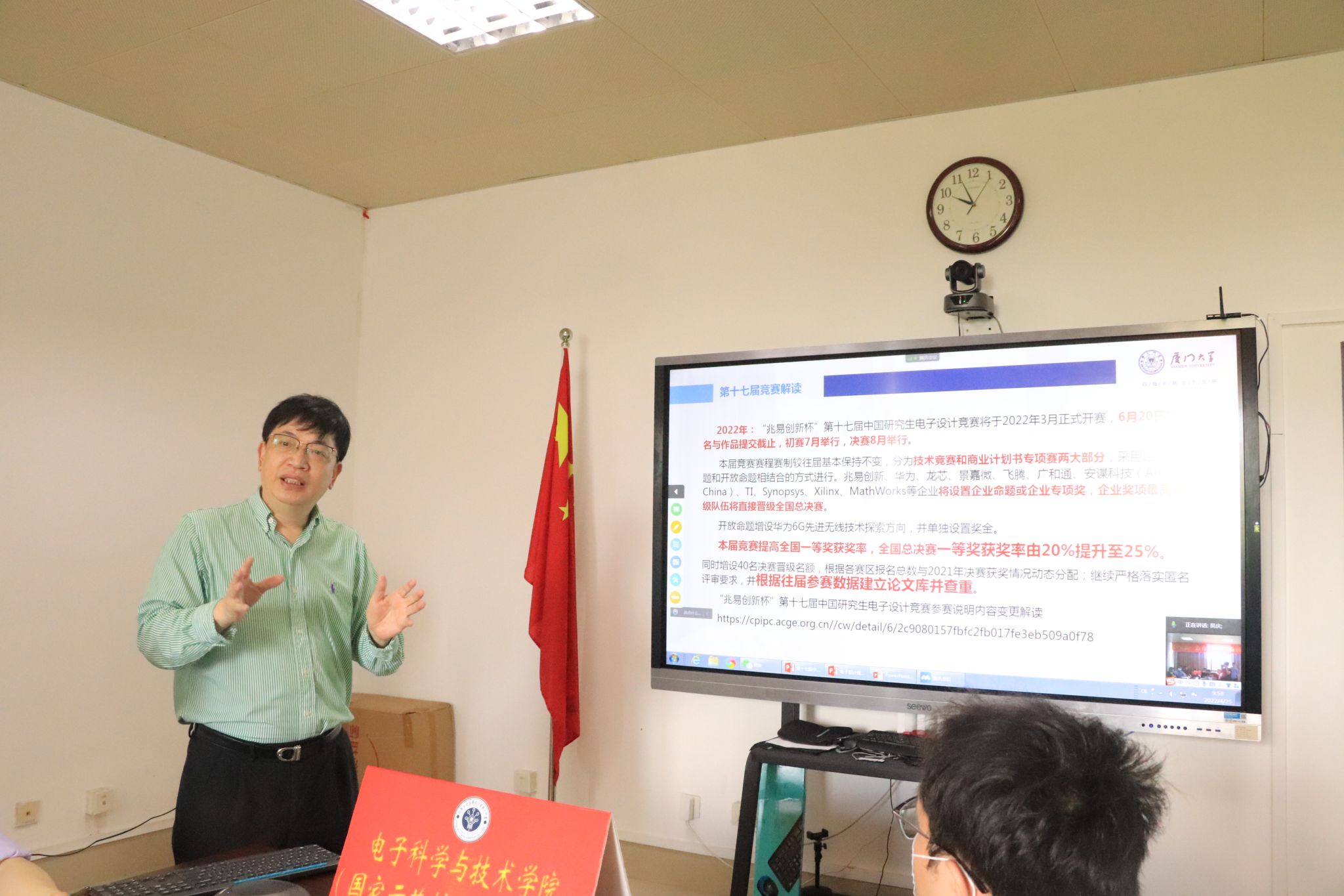 紧接着,程恩教授强调参加研究生电子设计竞赛时选题的重要性,分析了优秀作品的完整性、创新性等特点。之后程恩教授补充强调了报名企业赛的同学可以考虑同时报名技术赛。