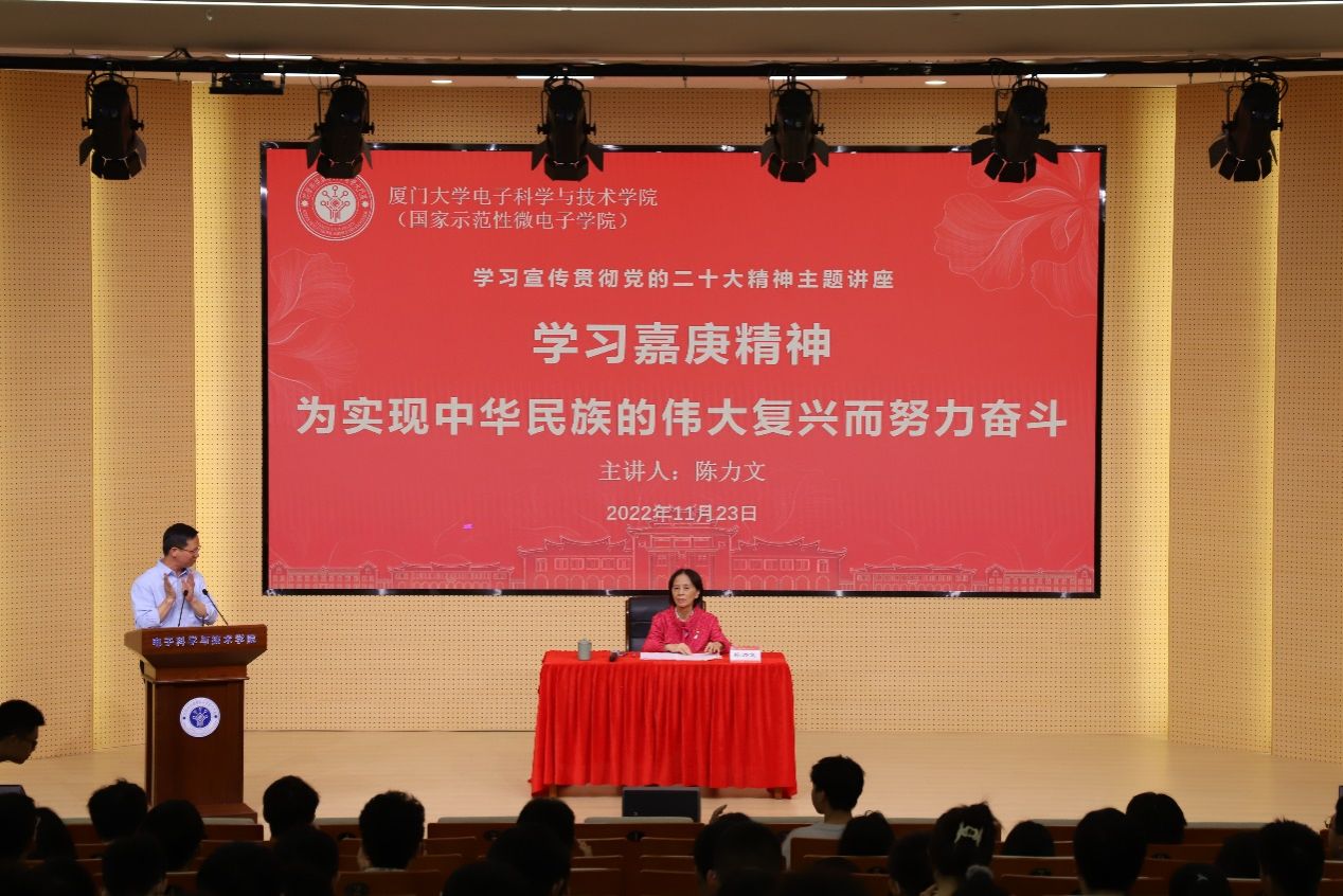 为学习贯彻党的二十大精神,进一步弘扬嘉庚精神,激励同学们奋进新时代,11月23日上午,学院特别邀请厦门大学原党委副书记、关工委顾问陈力文为2022级新生带来“学习嘉庚精神,为实现中华民族的伟大复兴而努力奋斗”的专题讲座。讲座由院党委副书记方银水主持,学院团委副书记刘锦锗、邵亢邑,辅导员严威参加活动。