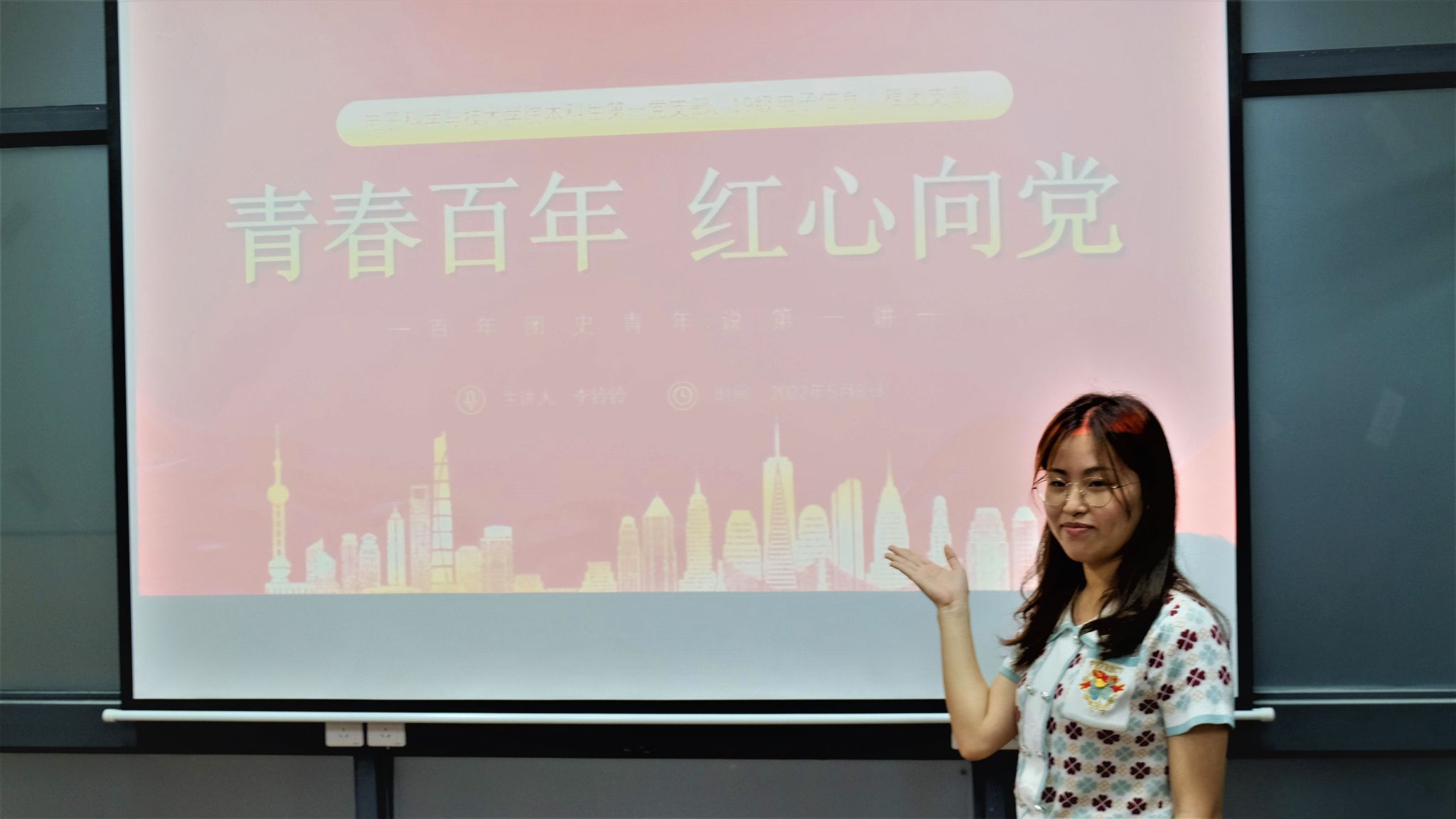 回望百年,青春向党。本科生第一党支部做百年团史主题汇报,开篇第一讲为“青春百年,红心向党”,由支部预备党员李铃铃主讲。在本次主题汇报中,她介绍了中国共青团的团旗与团徽,带领同学们一起回顾了一百年来不同阶段共青团的历程,并对五四运动、一二九运动做了重点汇报。学习之后,同学们深刻认识到中国共青团在跟随党的道路上是如此的坚定,虽过程曲折坎坷,但从未放弃在黑暗之中寻找光亮,上下求索,做出了巨大贡献。