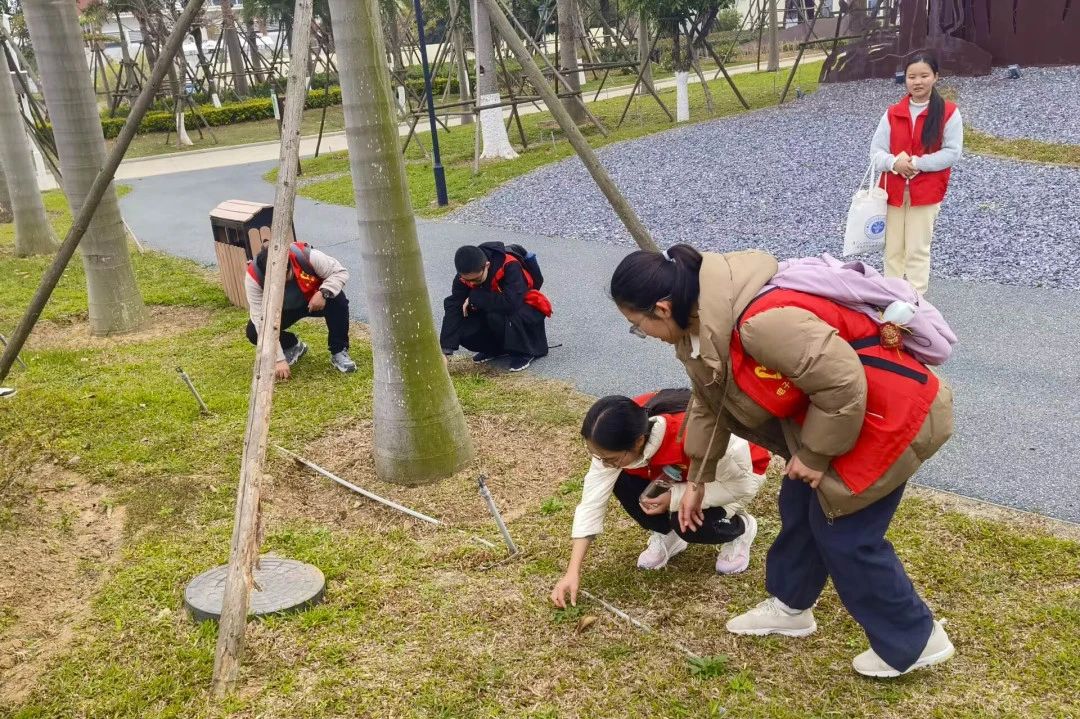 在八闽园,志愿者们边踏青边整理学院负责的莆田园。捡走白色、留下绿色,让八闽园的美更加怡人,在清新的环境中深刻体会绿水青山就是金山银山的理念。