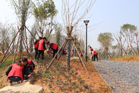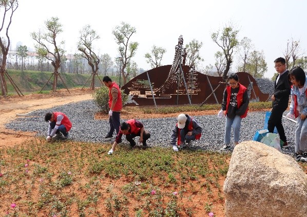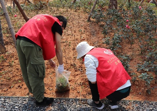 同学们为“八闽园”莆田文化小广场的月季花、萼距花除草松土
