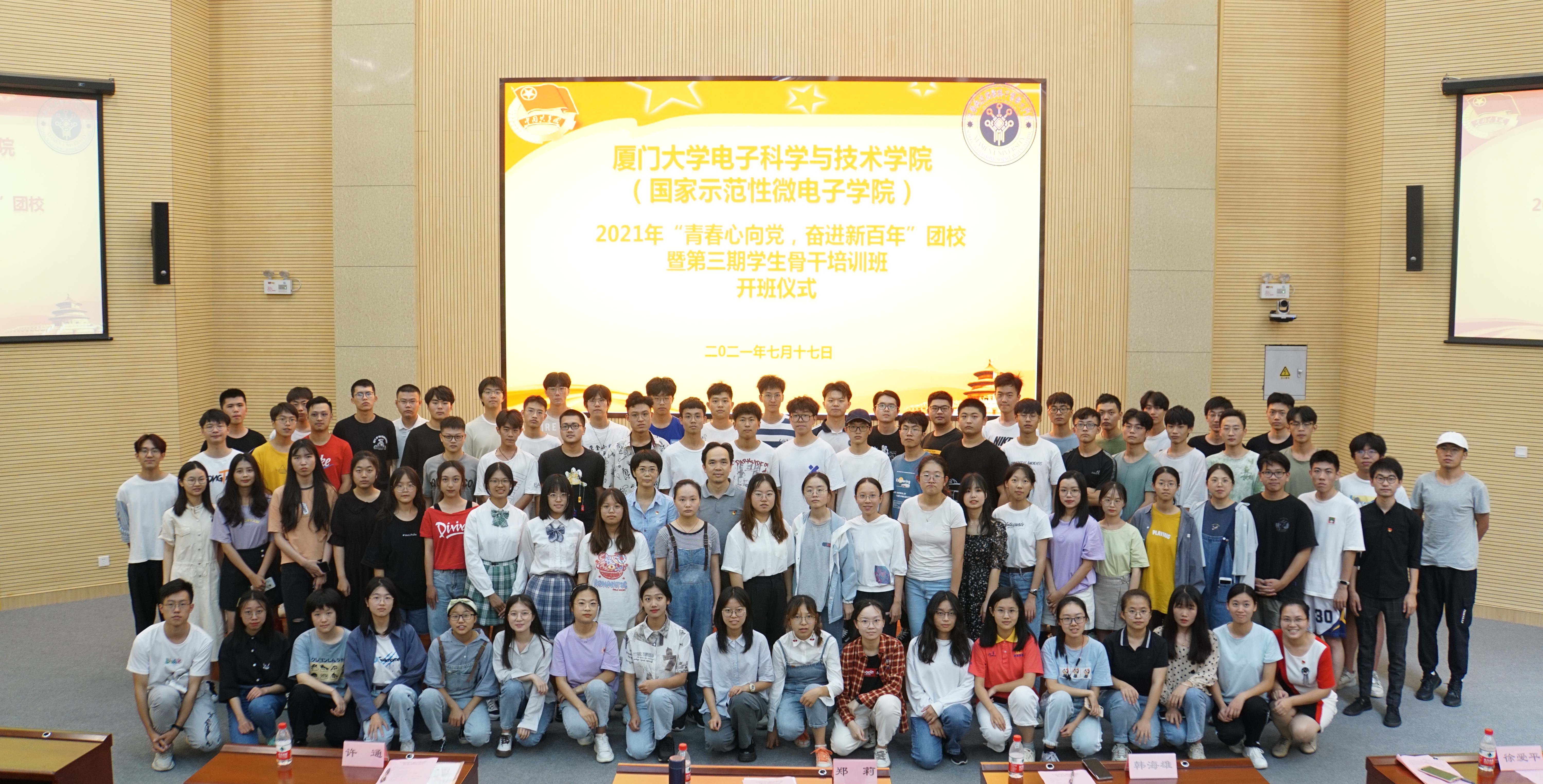 为庆祝中国共产党成立100周年,庆祝厦门大学建校100周年,深刻领悟习近平总书记在庆祝中国共产党成立100周年大会上的重要讲话精神和习近平总书记致厦门大学建校100周年贺信精神,我院于7月17日起举办“青春心向党,奋进新百年”2021年团校暨第三届大学生骨干培训班。本次培训班在学院党委指导下,由共青团厦门大学电子科学与技术学院委员会主办,学院各学生组织的106名学生骨干参加。