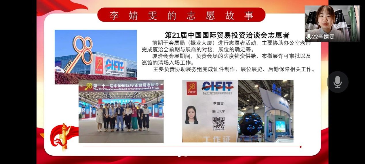志愿者李婧雯分享了自己在厦洽会时的志愿过程,作为一名大型赛事的志愿者,她介绍了审核证件、制作表格等每天的工作内容以及发生在身边很多有趣的故事,除此之外,她更在其中感受到了一个团队的凝聚力和团队内部和谐愉快的氛围,这类志愿服务让她收获到了眼界和学识。