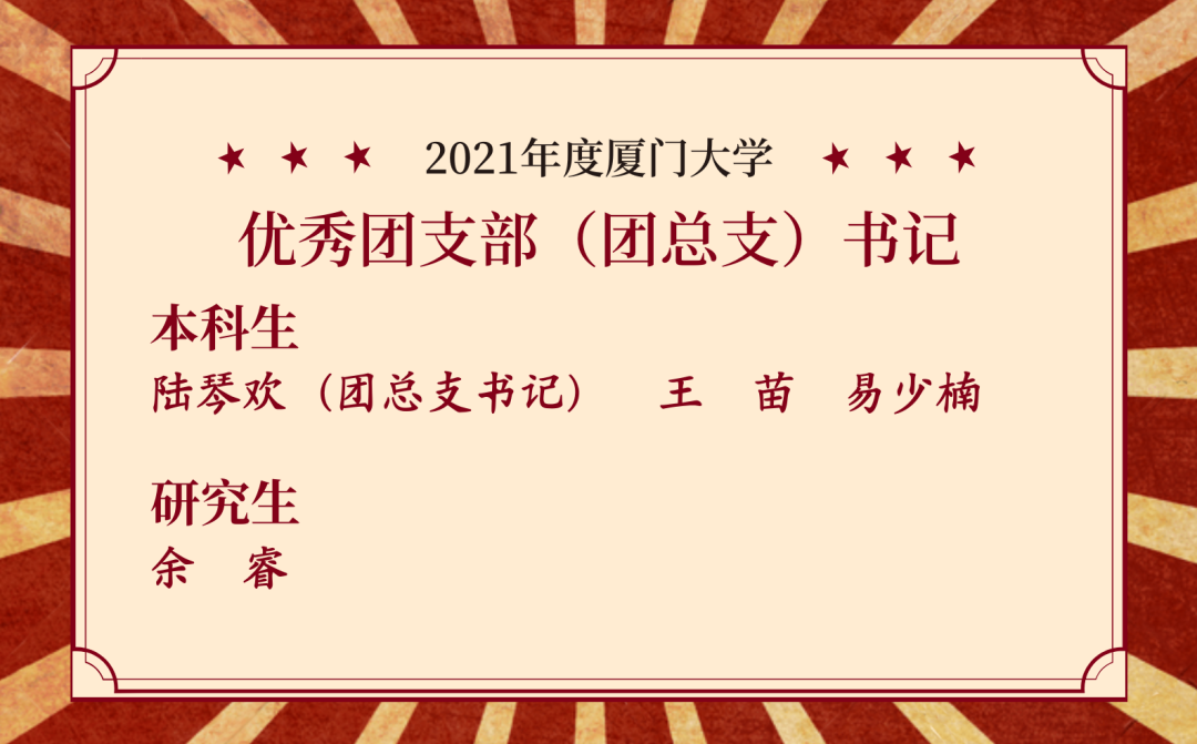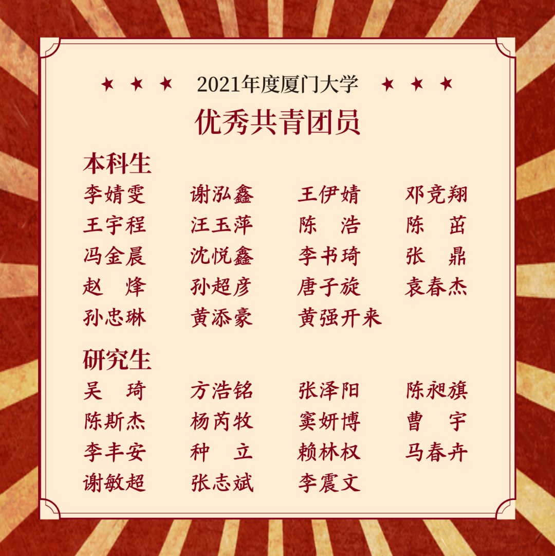 近日,共青团厦门大学委员会公布了《2021年度厦门大学共青团工作先进集体和先进个人拟表彰名单》。在本次表彰中,电子科学与技术学院共有3个团支部荣获“2021年度厦门大学五四红旗团支部”,4人荣获“2021年度厦门大学优秀团支部(团总支)书记”,34人荣获“2021年度厦门大学优秀共青团员”。现将名单公布如下。