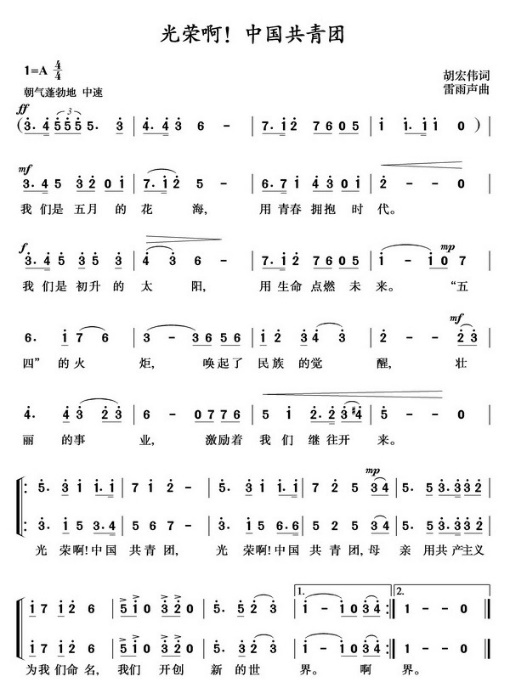1988年5月,在中国共产主义青年团第十二次全国代表大会上,经与会代表投票表决,《光荣啊,中国共青团》被最终确定为中国共产主义青年团的代团歌。《光荣啊,中国共青团》由胡宏伟作词、雷雨声谱曲,展现出一代代青年秉承革命的传统接力前进的昂扬面貌和担当,把复兴中华和把祖国建设得更加强大视为己任,继往开来。