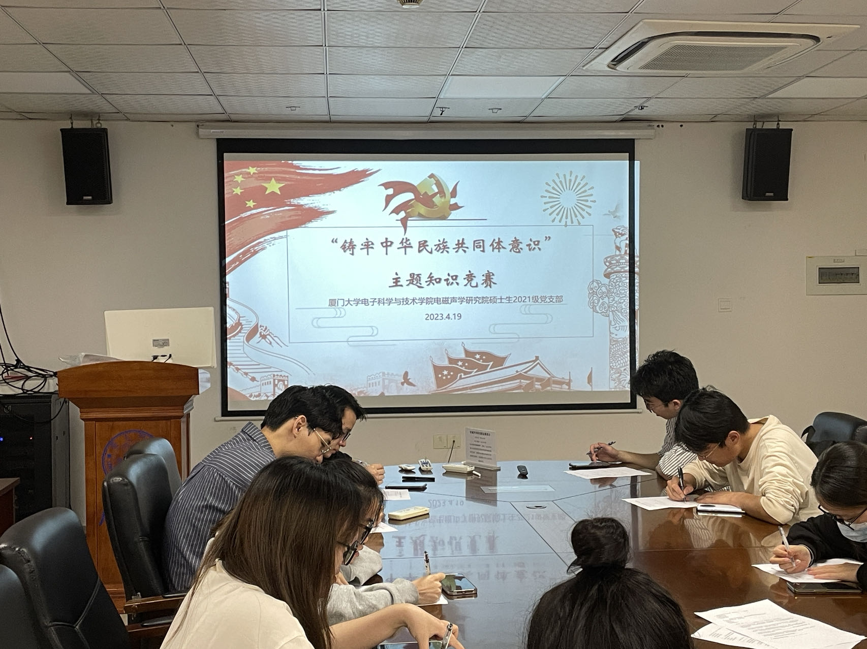 4月19日,电磁声学研究院硕士生2021级党支部在思明校区物机楼438会议室开展了“铸牢中华民族共同体意识”主题知识竞赛,党员同志积极学习了解以铸牢中华民族共同体意识为主线的知识,认真参加知识竞答,内容涉及中央民族工作会议讲话、民族团结、民族自治、共同富裕、乡村振兴、民风民俗等。通过本次知识竞赛,党员同志进一步检验对于中华民族共同体意识的学习掌握程度。