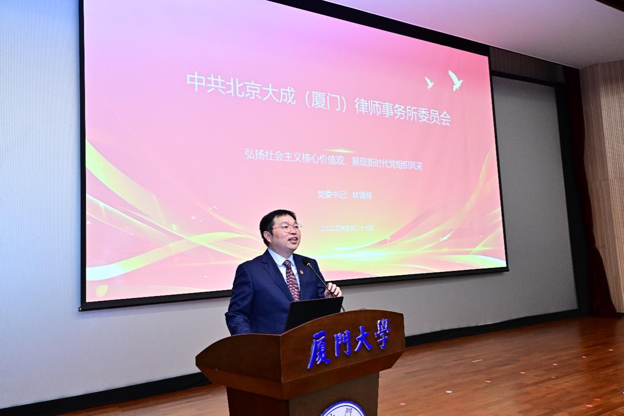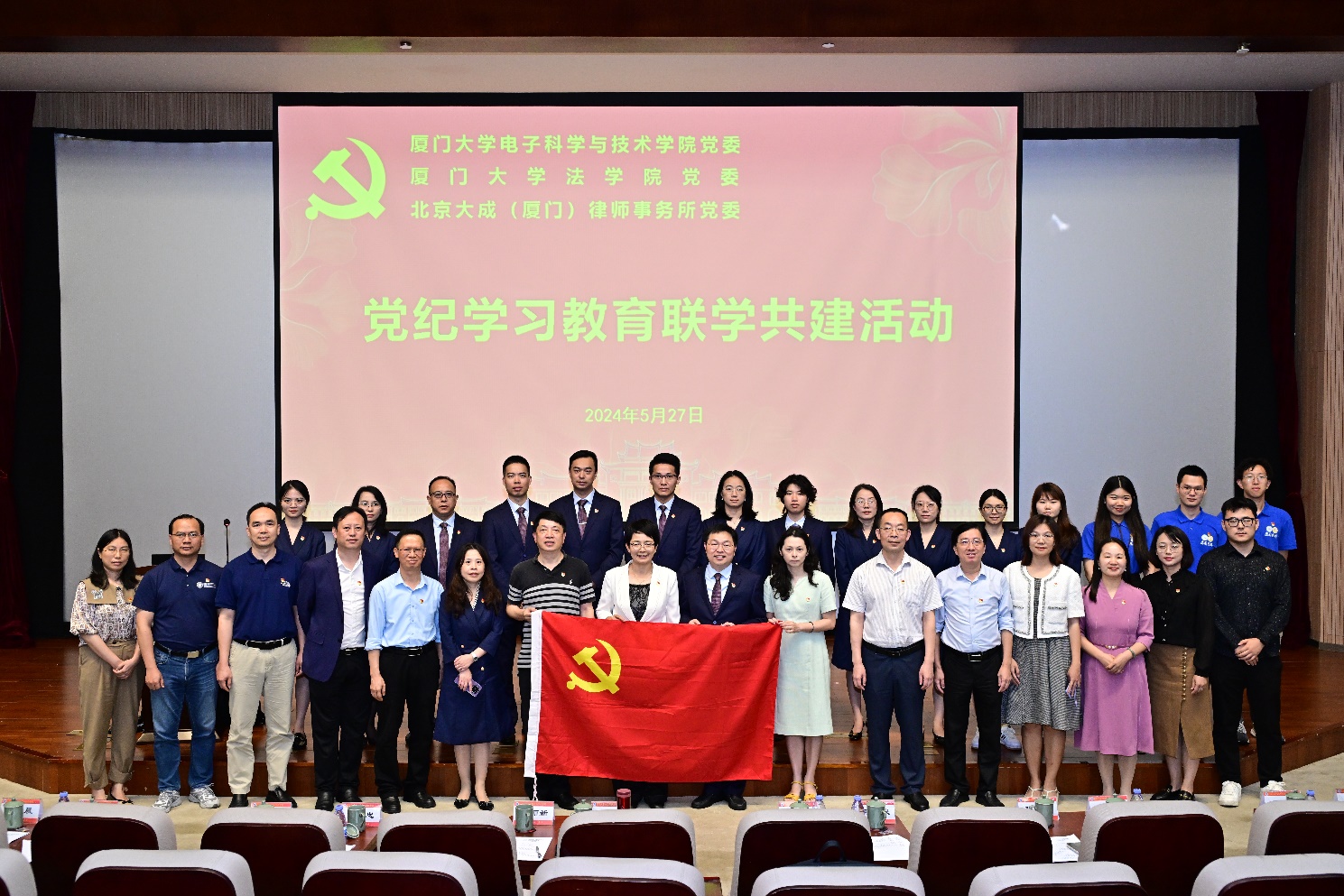 为深入贯彻落实习近平总书记关于党纪学习教育的重要讲话和重要指示精神,进一步增强全体师生党员的纪律和规矩意识,持续巩固深化师生党员党纪学习教育成果,5月27日下午,厦门大学电子科学与技术学院党委联合法学院党委、北京大成(厦门)律师事务所党委在翔安校区德旺图书馆1号报告厅举办党纪学习教育联学共建活动。厦门大学法学院党委书记何丽新,厦门市律协副会长、北京大成(厦门)律师事务所党委书记林镜桂,电子科学与技术学院党委书记石慧霞、院长陈忠出席活动。法学院党委、北京大成(厦门)律师事务所党委党员代表,电子科学与技术学院党委全体师生党员等600余人共同参加了共建活动。活动由石慧霞主持。
