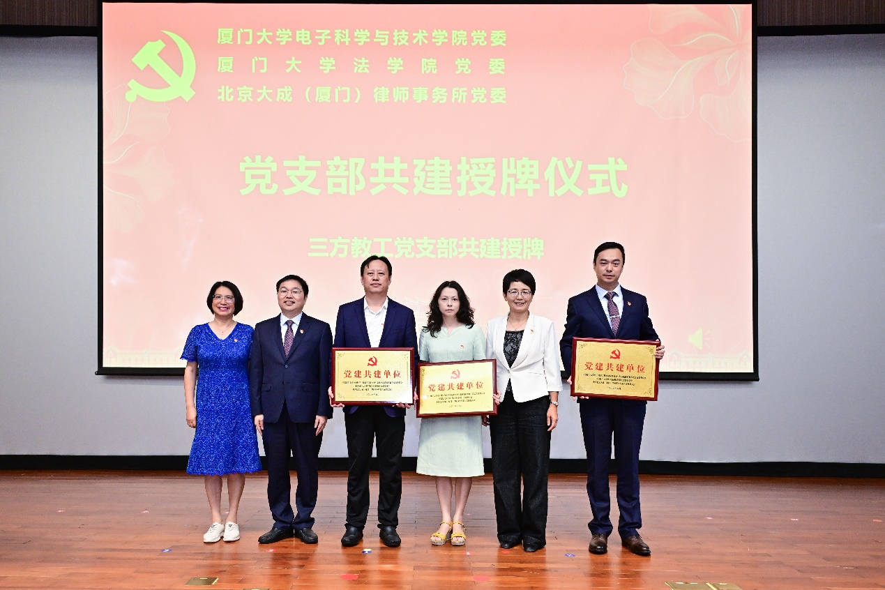 活动伊始,石慧霞、何丽新、林镜桂为法学院国际法教工党支部、北京大成(厦门)律师事务所第六党支部、电子科学与技术学院微电子与集成电路系师生联合党支部等三方共建教工党支部授牌,陈忠、何丽新为党规党纪学生研习社党支部、电子科学与技术学院电子科学系博士生党支部两院共建学生党支部授牌。
