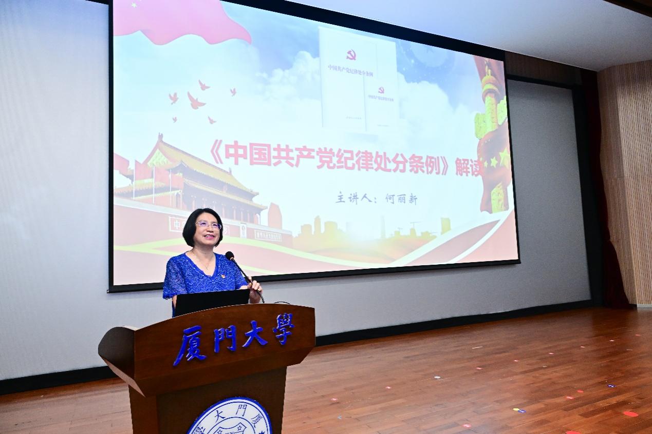 石慧霞在总结中强调《条例》是党的纪律的基础性法规,深入开展党纪学习教育是加强党的纪律建设、营造风清气正的育人环境、推动全面从严治党向纵深发展的重要举措,是学院努力朝向建设厦门大学一流学院的重要保障。她希望学生党员、教师党员、党政管理人员严格要求自己,学纪、知纪、明纪、守纪,把党的纪律转化为自律自省的行动自觉、内化为立德树人的价值追求、外化为爱岗敬业的行为习惯,以个人道德修养、人才培养质量、工作业绩成效检验党纪学习教育成果。