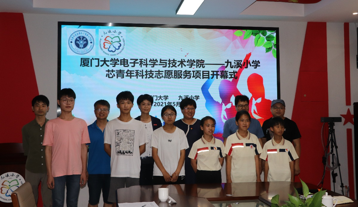 九溪小学是翔安区直属小学,距离厦大翔安校区约6公里。2021年5月以来 ,在翔安区教育局的牵头下,电子学院与九溪小学经过多次接触洽谈,最终商定开展芯青年科技志愿服务项目,电子学院志愿者为九溪小学创客社团讲授以编程创客项目、物联网和智能小车项目为主的课程。