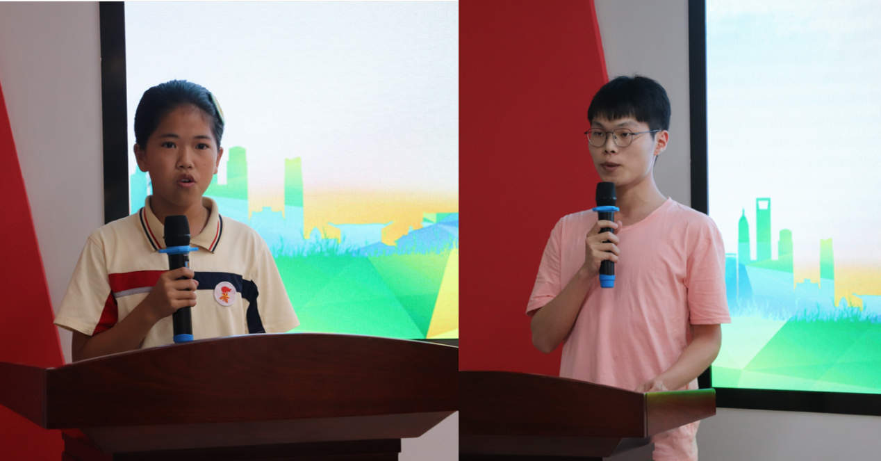 九溪小学学生代表陈思彤发言,稚嫩的童声毫不怯场,对学习和知识的渴望溢于言表。2020级学生瞿祖旭代表志愿者们郑重表态,将用耐心、爱心和细心为同学们授课、答疑、解惑。