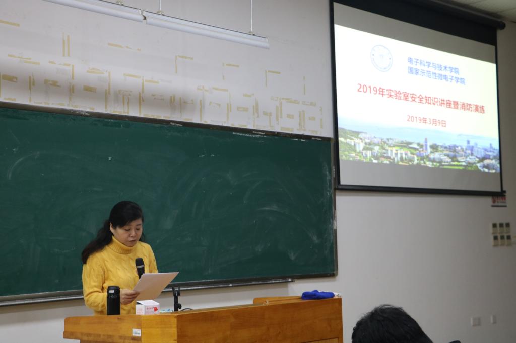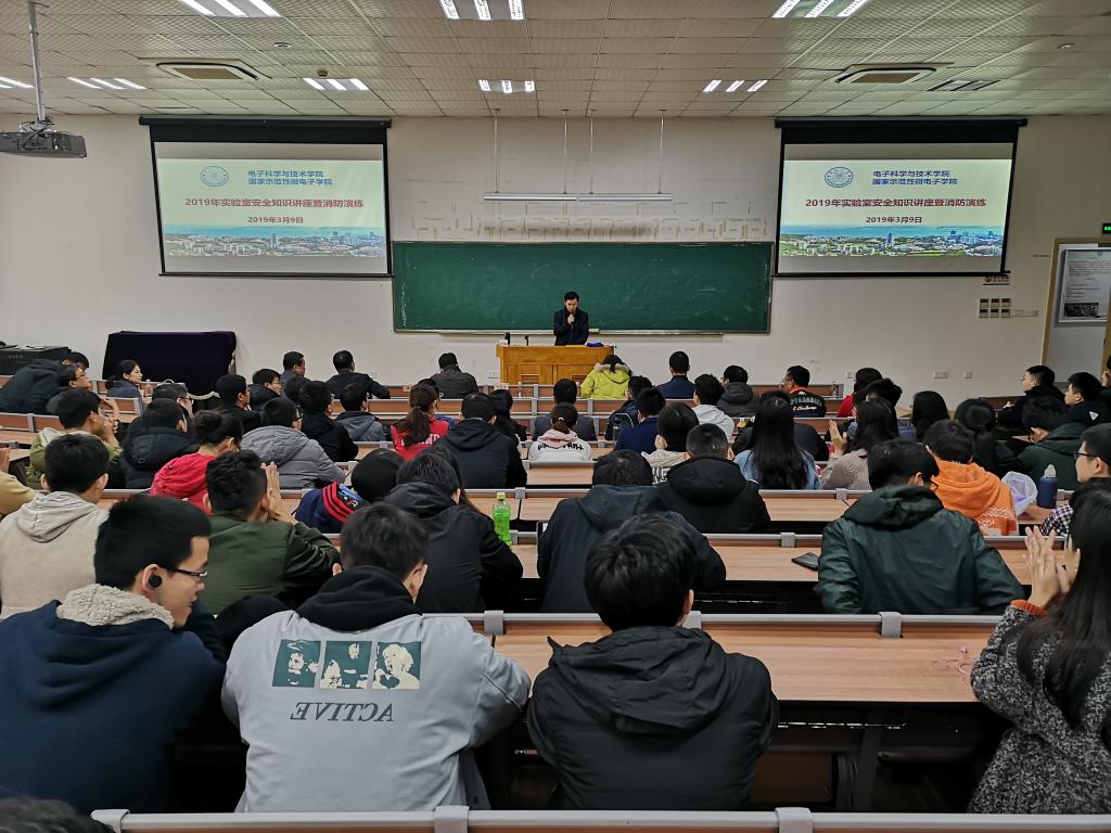 2019年3月9日,为提高全院师生的安全意识、丰富全院师生的安全知识与技能,电子学院举办实验室安全知识讲座暨消防演练活动。校实验室与设备管理办公室主任施芝元教授、保卫处防火与交通安全管理科副科长孙俊逸、院党委书记吴国瑛、主持工作副院长陈忠教授、副院长董俊教授等出席活动,学院安全工作领导小组及办公室成员、各实验室安全负责人、各班级安全委员、各课题组学生负责人、研究生代表等近200名师生参加活动,活动由院党委副书记方银水主持。
