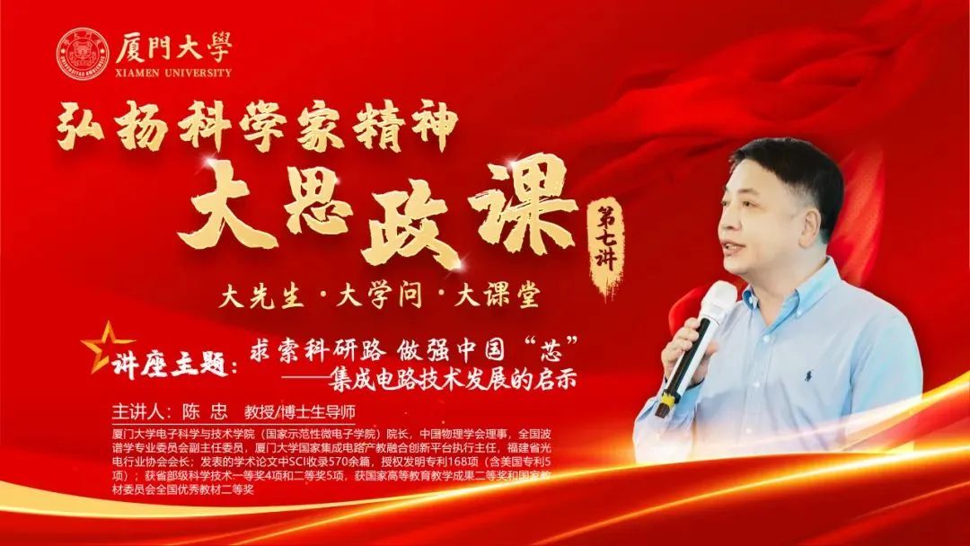 为深入贯彻实施“时代新人铸魂工程”,培养具有引领性、人文性、时代性、开放性的拔尖创新人才,11月25日在南存钿楼C栋4楼报告厅,电子科学与技术学院院长陈忠教授以“求索科研路,做强中国“芯”——集成电路技术发展的启示”为主题,结合自身丰富的工作经历、研究领域及学术成就,为师生们讲述生动鲜活的科学家故事,深入浅出地阐释科学家精神的丰富内涵与时代价值,助力芯青年成为国家需要的优秀人才。