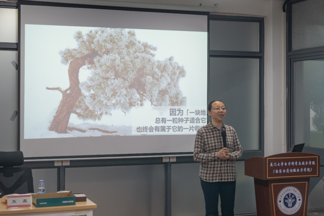 接下来,聂鑫向同学们分享了一个生动且富有哲理的故事。一个女孩尝试了许多不同职业,但屡屡碰壁,就在她对于自身能力与价值存在怀疑,并想要放弃的时候,她的母亲给予了她关怀与安慰。母亲说:“一块地总有一粒种子适合它,也总会有属于它的一片收成”。在母亲的开导鼓励下,女儿更换职业赛道,并在多年后取得了巨大的成功。聂鑫以此告诉同学们:一个人暂时的失败并不能说明他能力的欠缺,找对适合自己的土地,并将才华播撒其上,终有一日会获得人生的丰收。