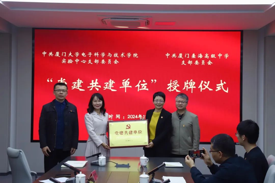 会上,学院实验中心党支部与厦门熹海高级中学党支部进行了党建共建,石慧霞、许军凉、郑希共同见证授牌。本次党建共建为大中小学思政课一体化建设奠定坚实的组织基础,未来双方将进一步资源共享、优势互补,推动党建与科创育人深度融合,以科创育人“小切口”上好有电子学科特色的“大思政课”。