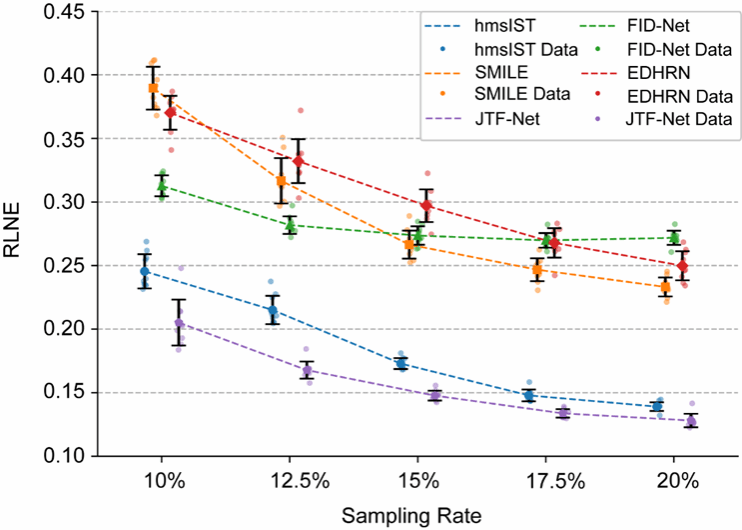 图2. 在不同采样率(10%、12.5%、15%、17.5% 和 20%)下,JTF-Net、hmsIST、SMILE、FID-Net 和 EDHRN 之间的 RLNE 比较。